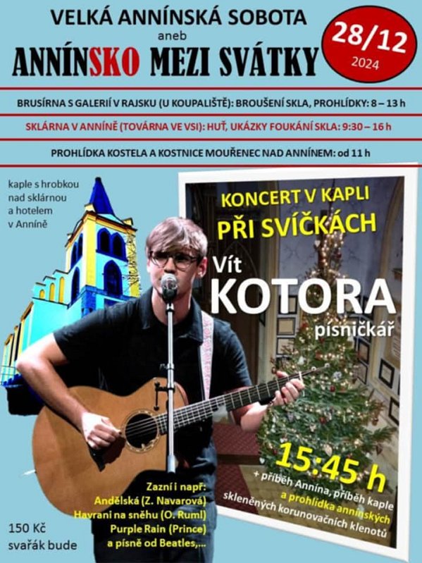 Srdečně všechny zveme v sobotu 28.12.2024 do Annína, kde celý den probíhají akce uvedené na přiloženém plakátku. Po návštěvách místních skláren si přijďte poslechnout koncert při svíčkách, bude plný příjemných a milých melodií v podání Víta Kotory. Koncert proběhne v kapli rodiny Schmid nad hotelem Annín od 15:45 h.